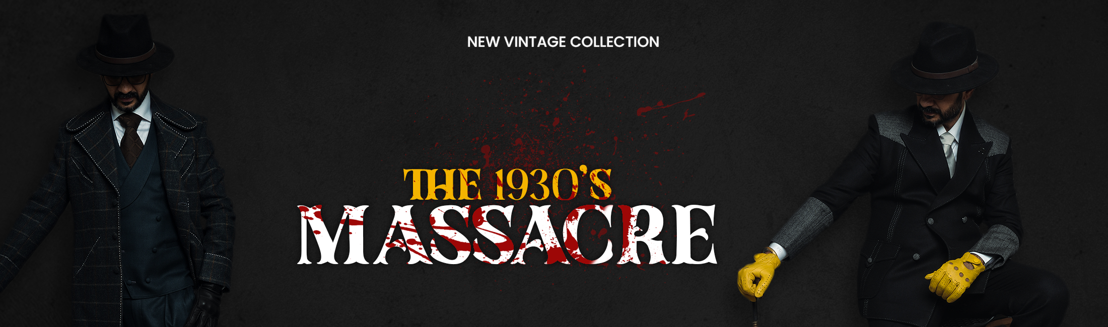 Man in vintage attire with text 'New Vintage Collection The 1930's Massacre' on a dark background