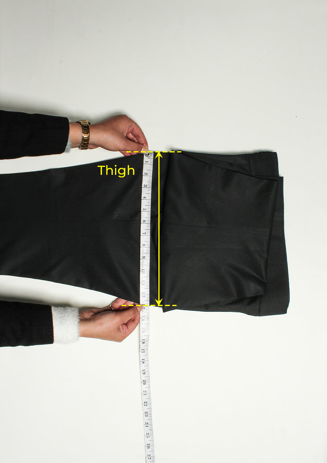 To measure the thigh width, lay the pants flat and measure across the widest part below the crotch. Double the measurement for the full thigh circumference.