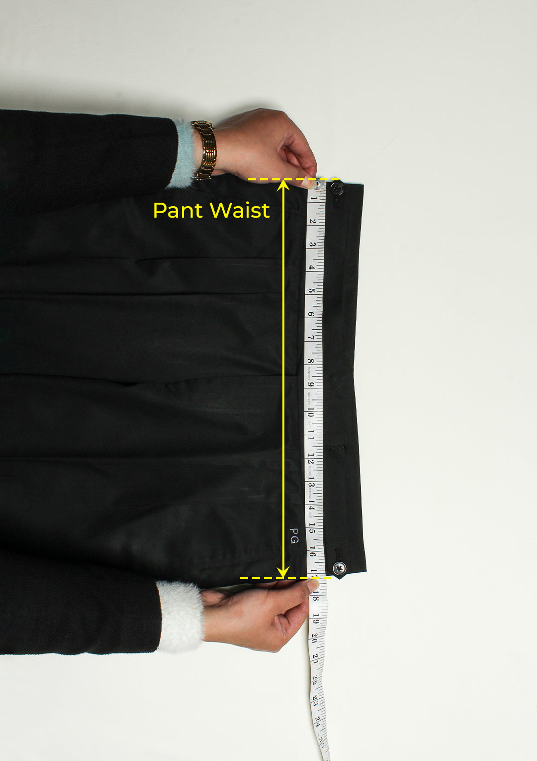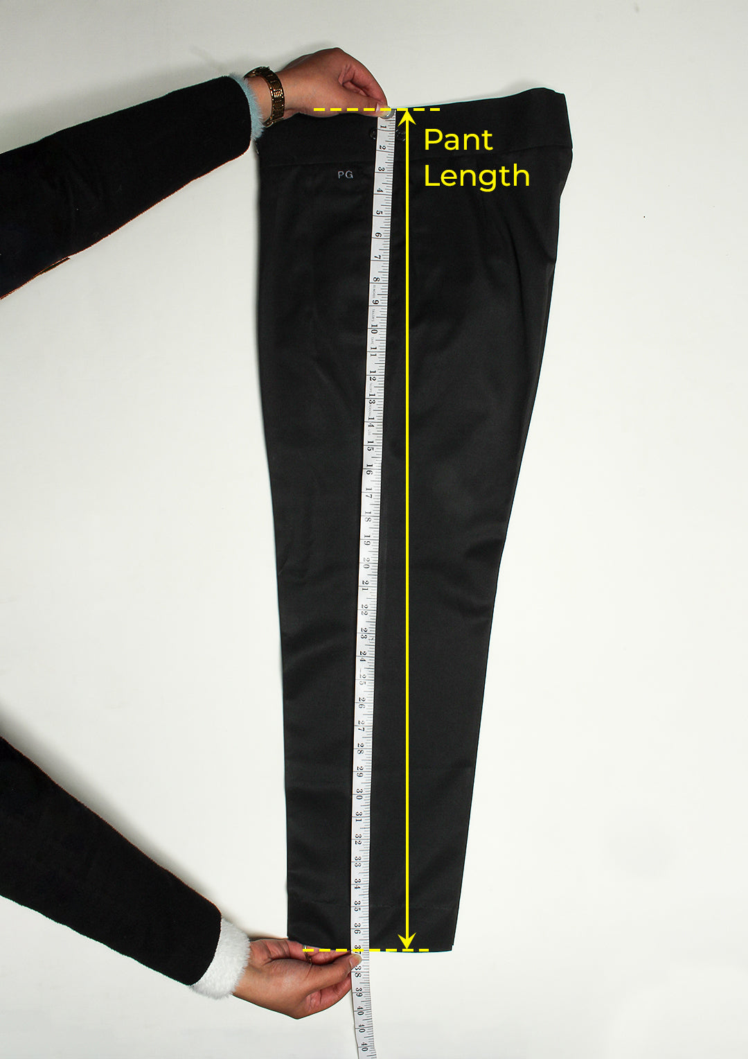 To measure the pant length, lay the pants flat and measure from the top of the waistband to the bottom hem along the outer leg.