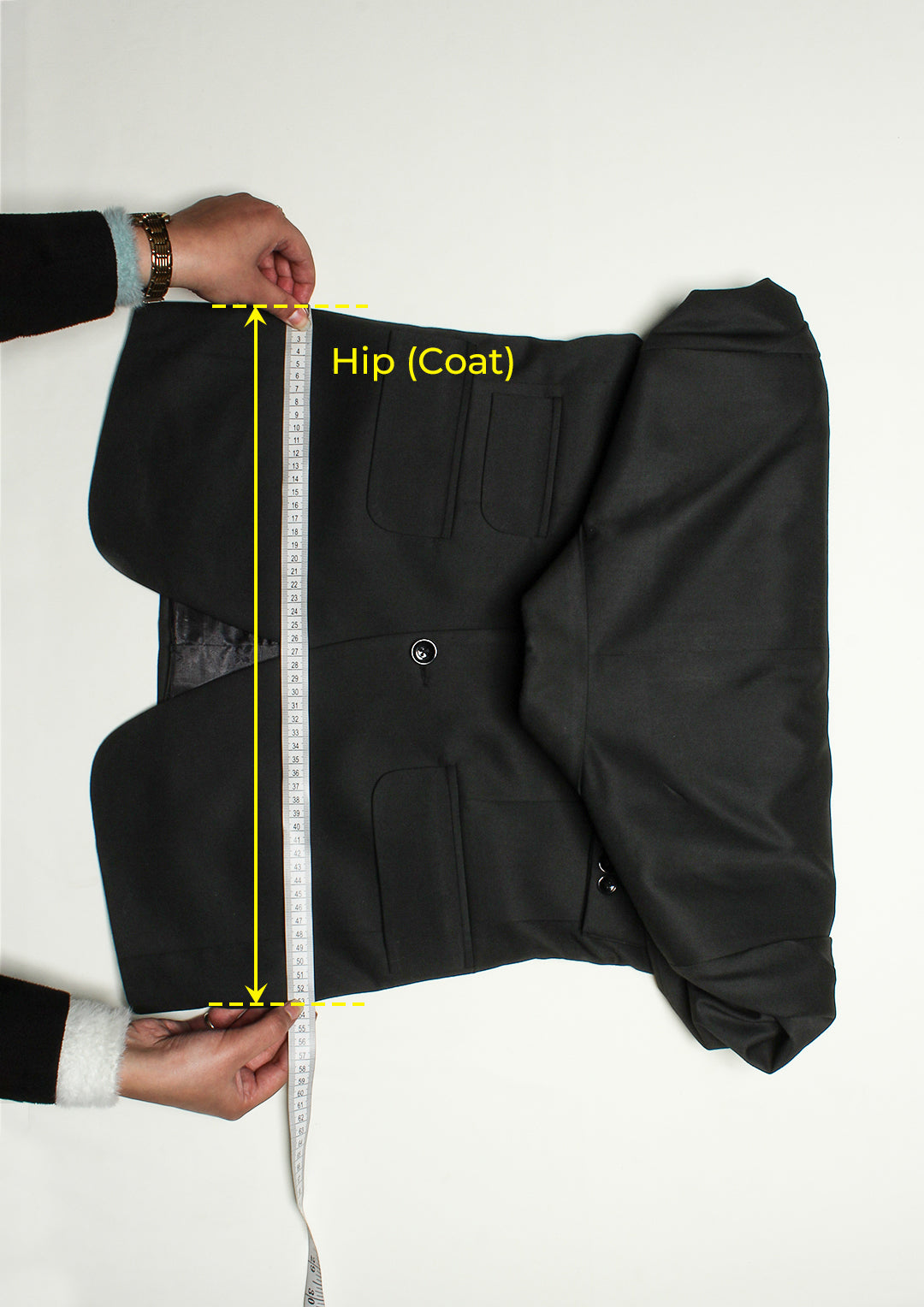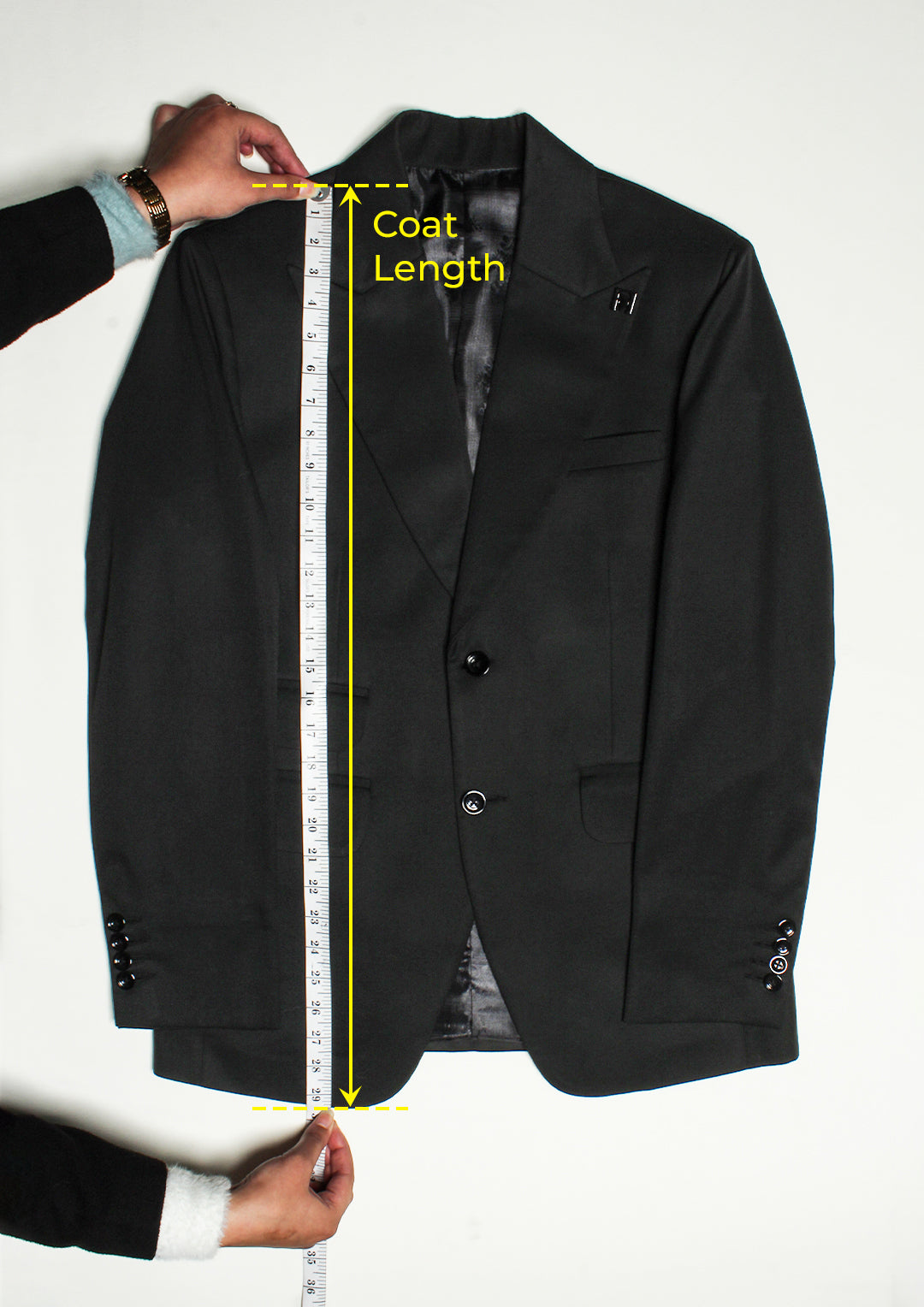 To measure a coat length, lay it flat with the back facing up. Measure from the base of the collar seam to the bottom hem for the total length.