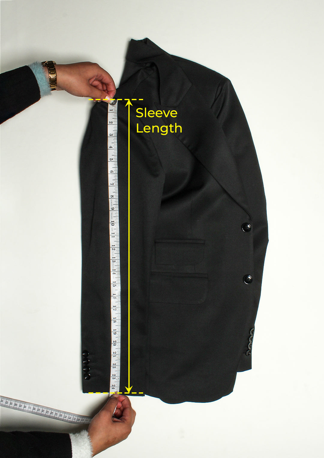 Measure from the shoulder seam to the end of the sleeve cuff.