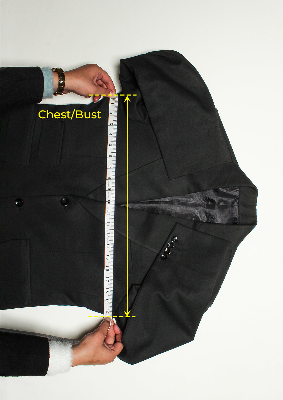 To measure the chest width, lay the jacket flat with buttons fastened and measure across from underarm seam to seam. Double this for the full chest measurement.
