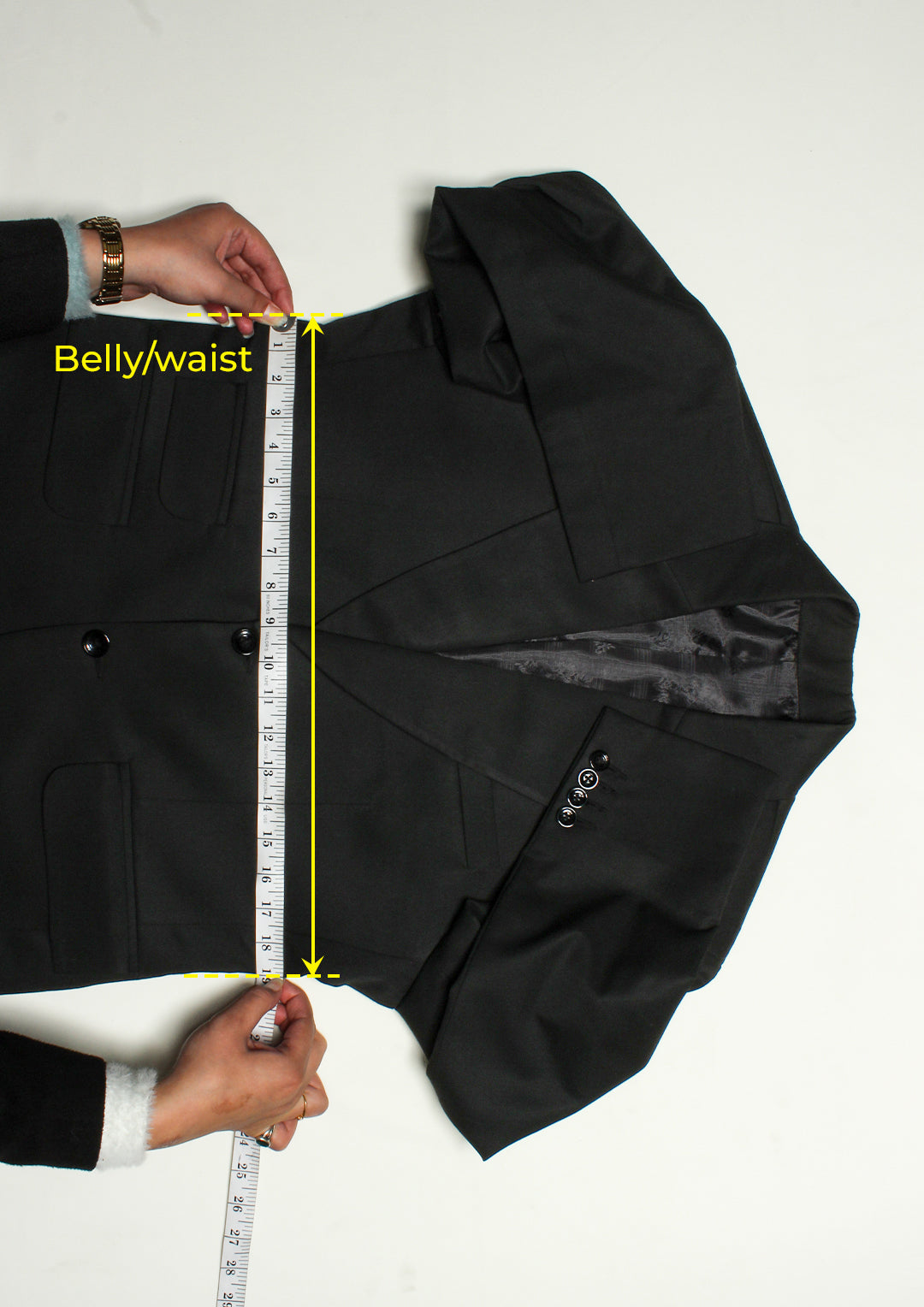 Lay the jacket flat, fasten the buttons, and measure across the narrowest part of the waist. Double this for the full waist circumference.