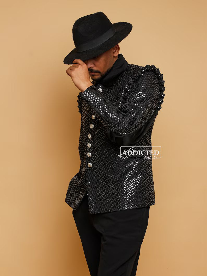Indulge in bespoke luxury with our men's customized 2-piece wedding suit. Crafted from black cotton, the frilled shoulder jacket features puff sleeves and functional cuffs, exuding sophistication. Paired with high waist pants, it's a statement of refinement for cocktail or prom attire. Plus, receive complimentary gifts to elevate your ensemble.
