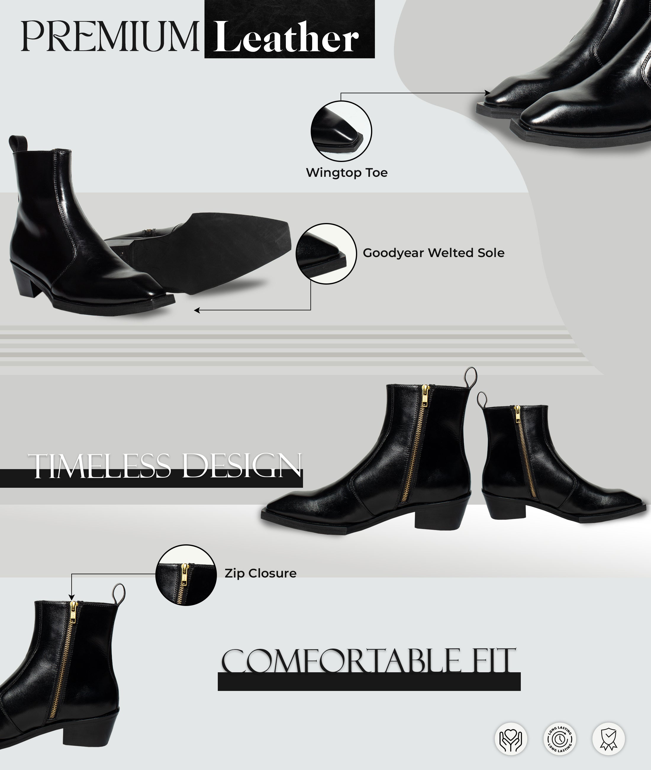 Elevate your style with these sleek black leather ankle boots, meticulously crafted for sophistication and durability. Made from premium full-grain leather with a rich glossy finish, these boots offer both elegance and long-lasting wear. Featuring a sharp square toe and a sturdy block heel for comfort and stability, they are designed for versatility—perfect for formal occasions or everyday luxury. The premium gold zip closure ensures effortless wear, while the Goodyear welt construction guarantees superior durability and a refined look. Step up your wardrobe with these handcrafted boots, designed for the modern trendsetter.