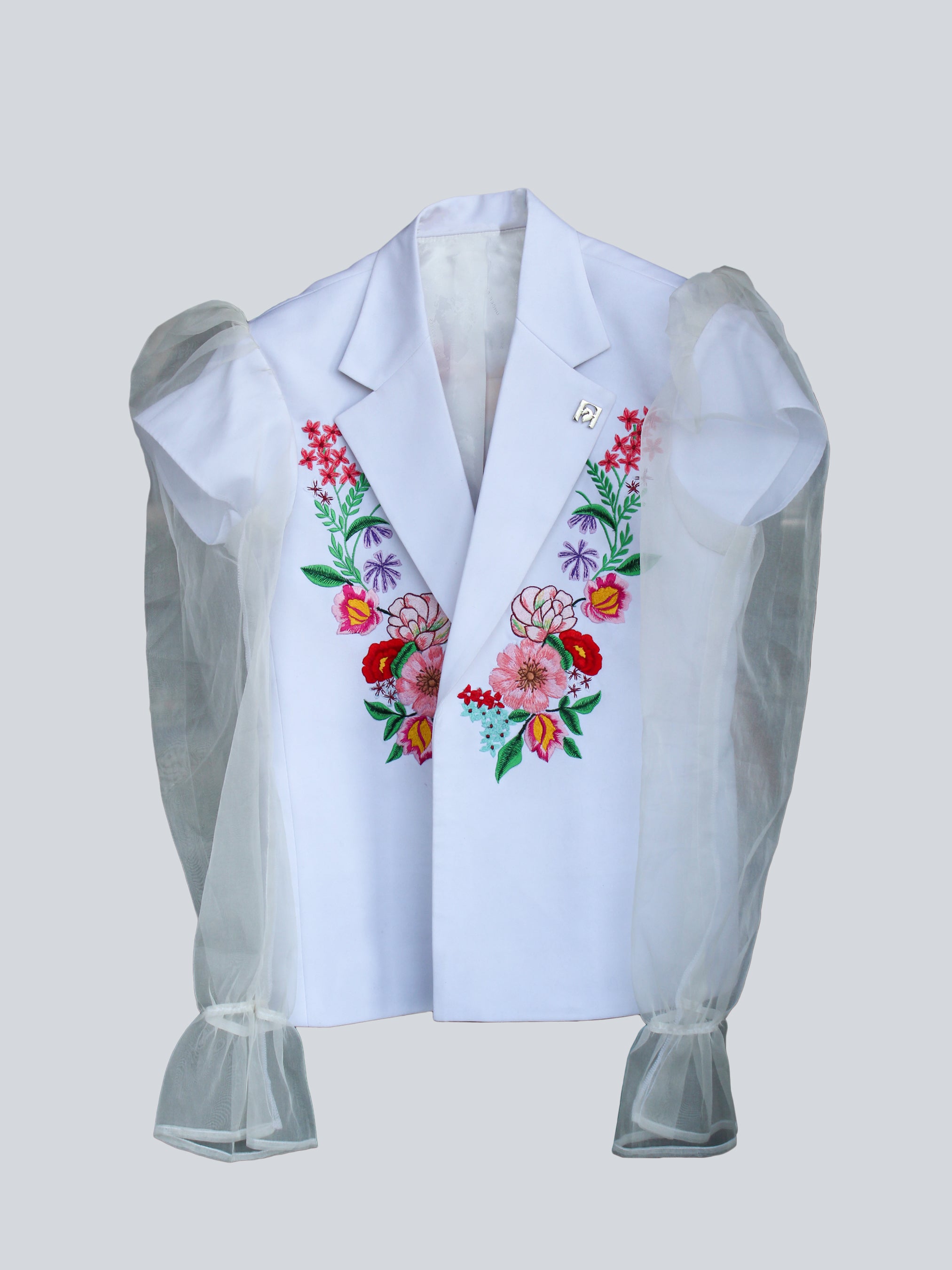 Make a bold fashion statement with our Floral Fantasy Suit, showcasing vibrant floral embroidery on soft white fabric. The standout design and elegant details, including organza-inspired touches, blend contemporary style with timeless sophistication. Perfect for fashion-forward events or special occasions, this custom-made suit is truly one of a kind.