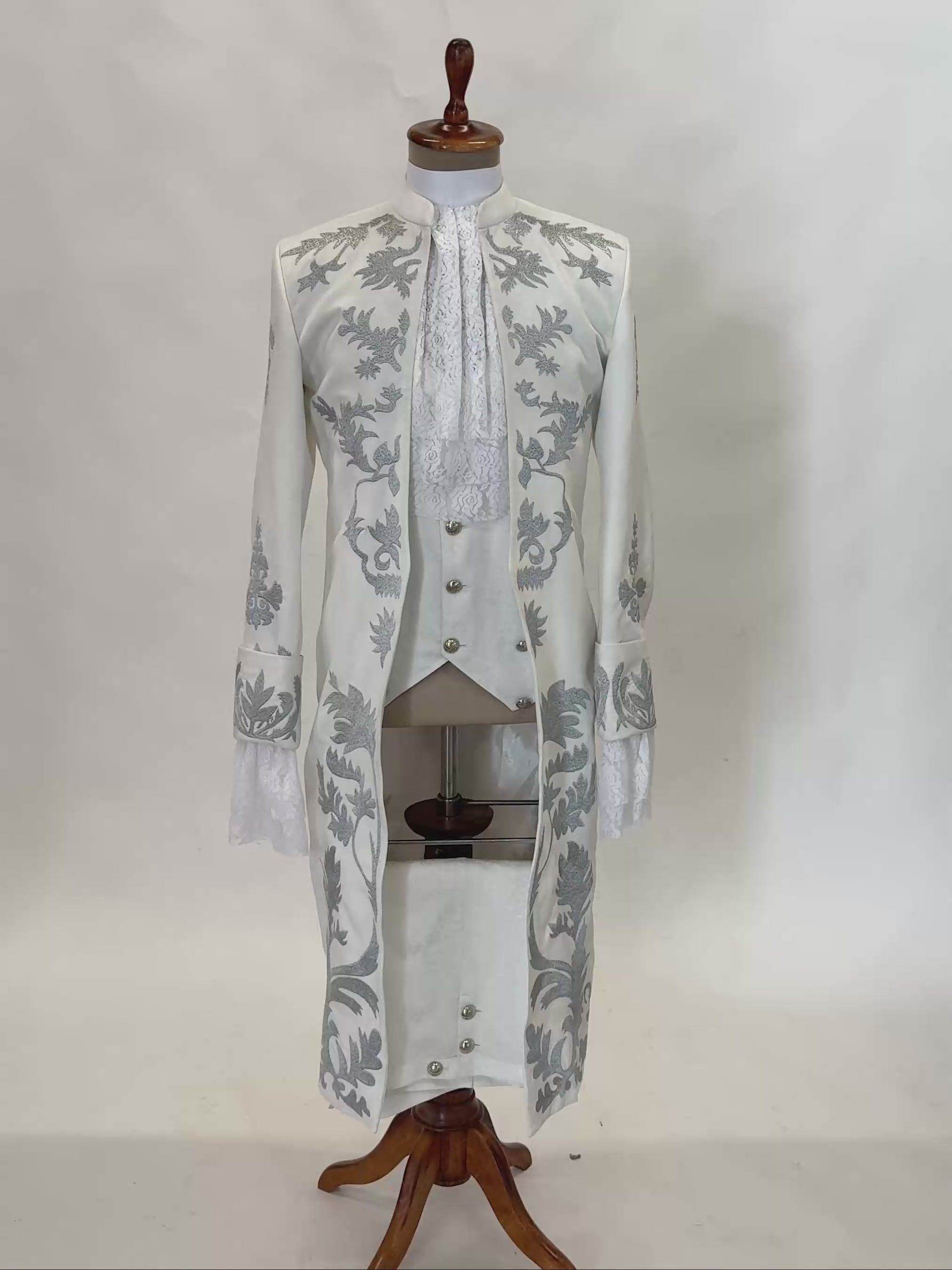 The Ivory Baroque Historical Costume is a meticulously crafted ensemble inspired by 18th-century European aristocracy. Featuring an ivory frock coat with ornate silver embroidery, lace cuffs, and a tailored waistcoat, this historical costume reflects royal baroque elegance. Ideal for period events, theatre productions, historical reenactments, and couture collectors.