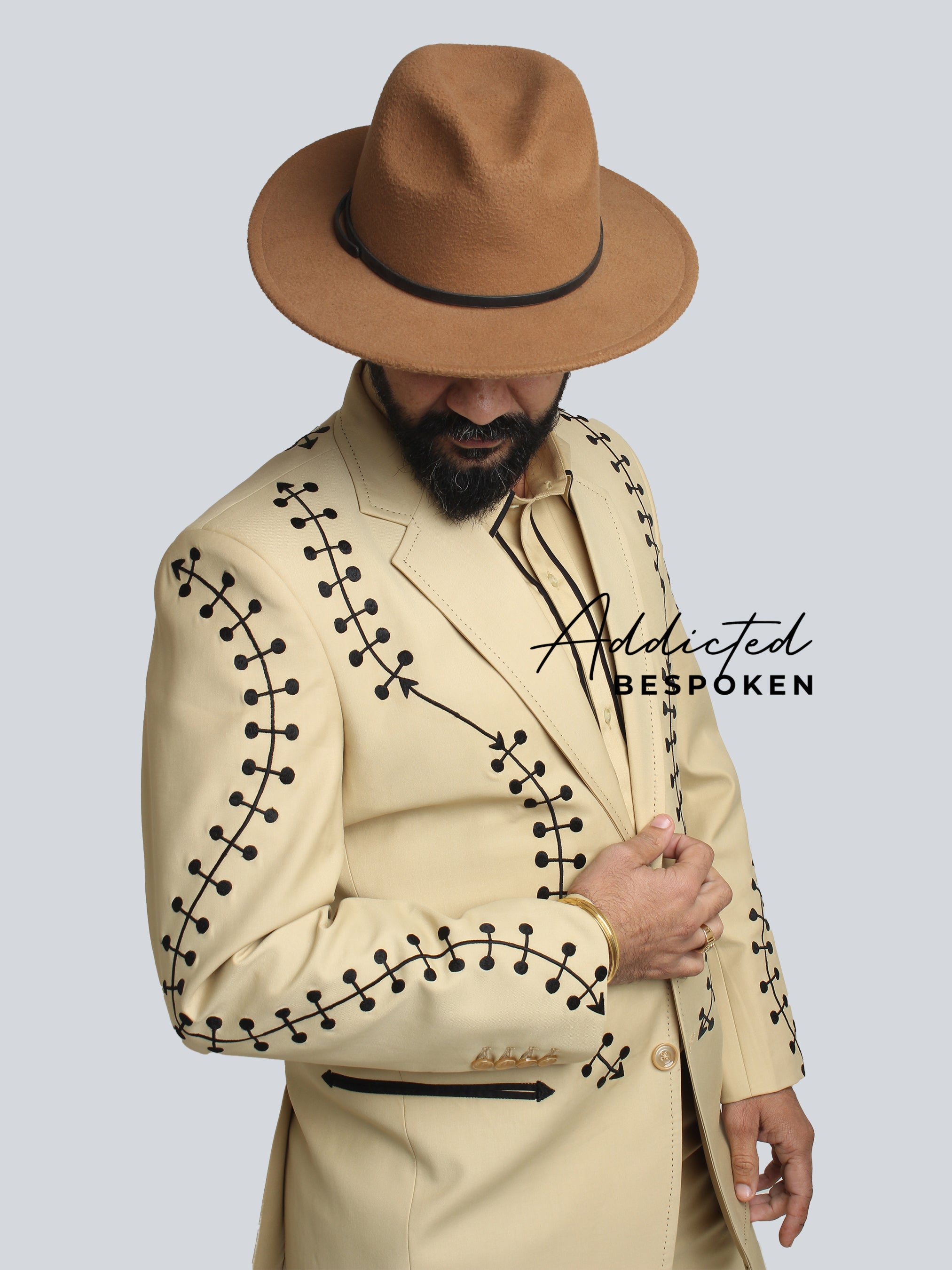 Designer Men's 2-piece suit features an embroidered blazer, a premium cotton cowboy-style shirt, and designer pants. Perfect for making an impression at parties, weddings, or cowboy-themed events, this custom-made, single-breasted button-closure country-western suit with notch lapels is a wardrobe essential.