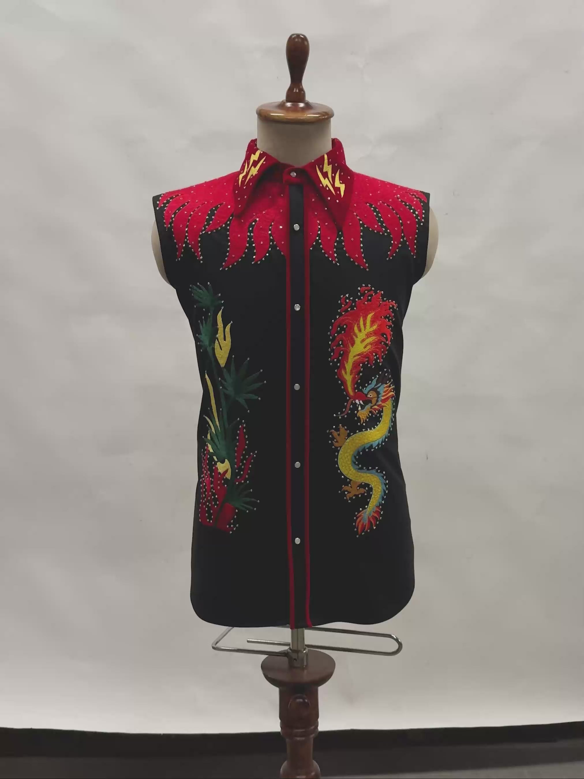 The Midnight Dragon Embroidered Shirt in black is a bold couture statement crafted with intricate dragon and flame embroidery. Set against a deep black base, the hand-embroidered detailing creates striking contrast and depth. Designed for luxury styling, this designer embroidered shirt blends mythical symbolism with modern tailoring for standout evening and occasion wear.