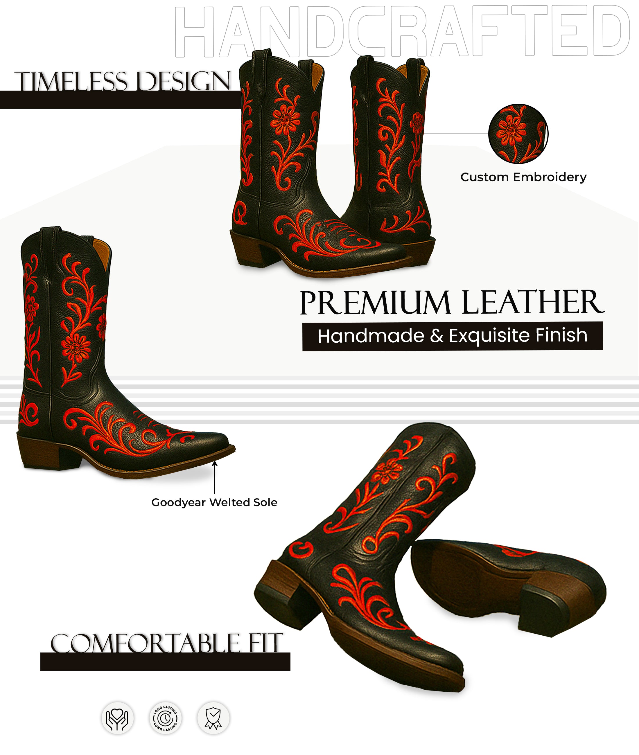 Command attention with the Midnight Ember Western Boots, a fierce fusion of elegance and edge. Crafted from premium black leather, these boots are set ablaze with intricate crimson embroidery, swirling in bold floral and vine motifs from vamp to shaft. Designed with a traditional cowboy silhouette, they feature a pointed toe, deep scallop top, and a stacked wooden heel for that perfect western stance. Whether you're headed to the rodeo or the runway, these boots bring fiery sophistication to every step.