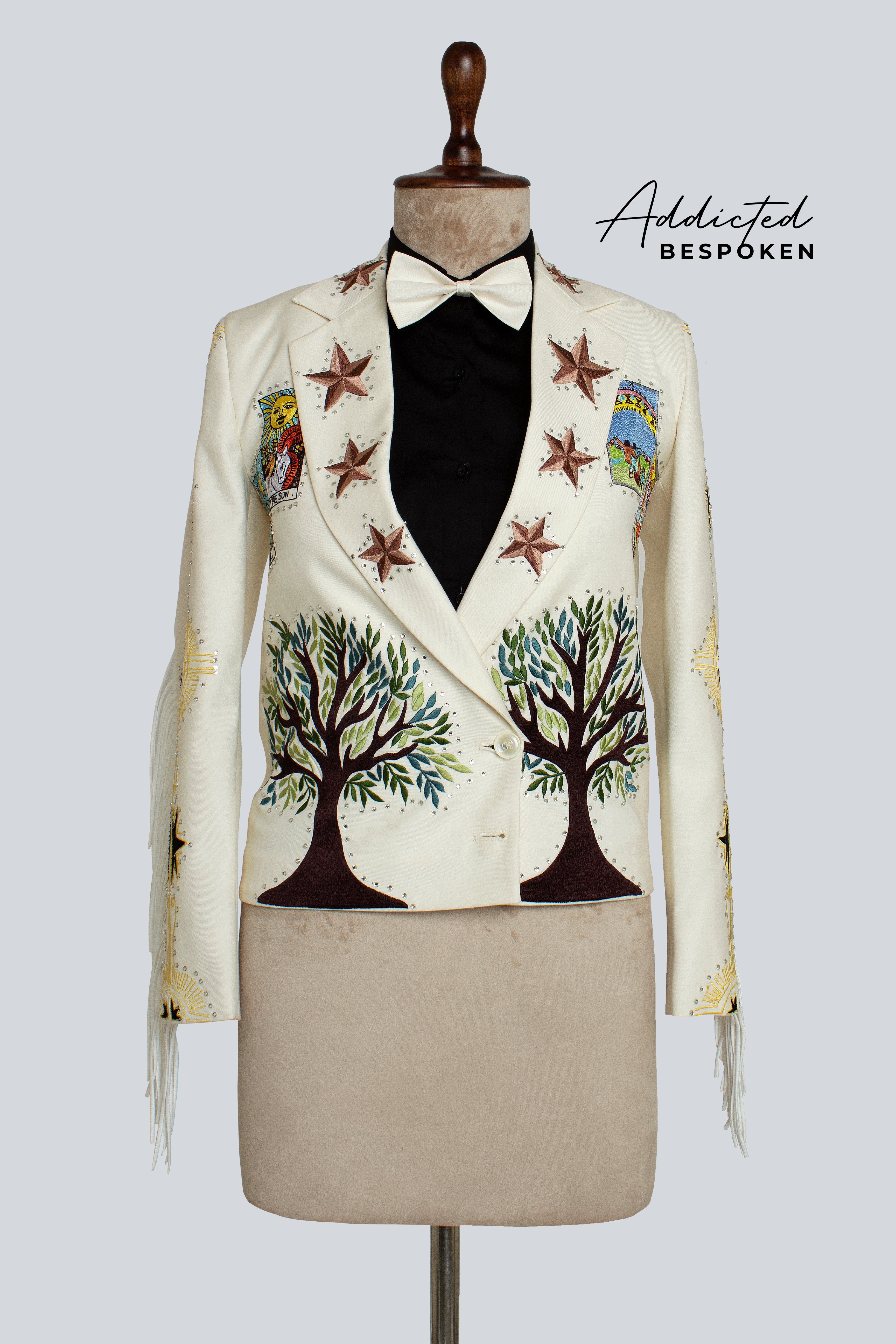 This custom-made country wedding suit is the perfect choice for couples who want to look their best on their big day. This western suit is embroidered with intricate, customized designs. The embroidery is done in a variety of colors, including white, green, and yellow. The white color is both classic and stylish. Make your wedding a truly memorable occasion with our country wedding suit. Elevate your style and celebrate your special day in a suit that reflects the rustic elegance of the countryside.
