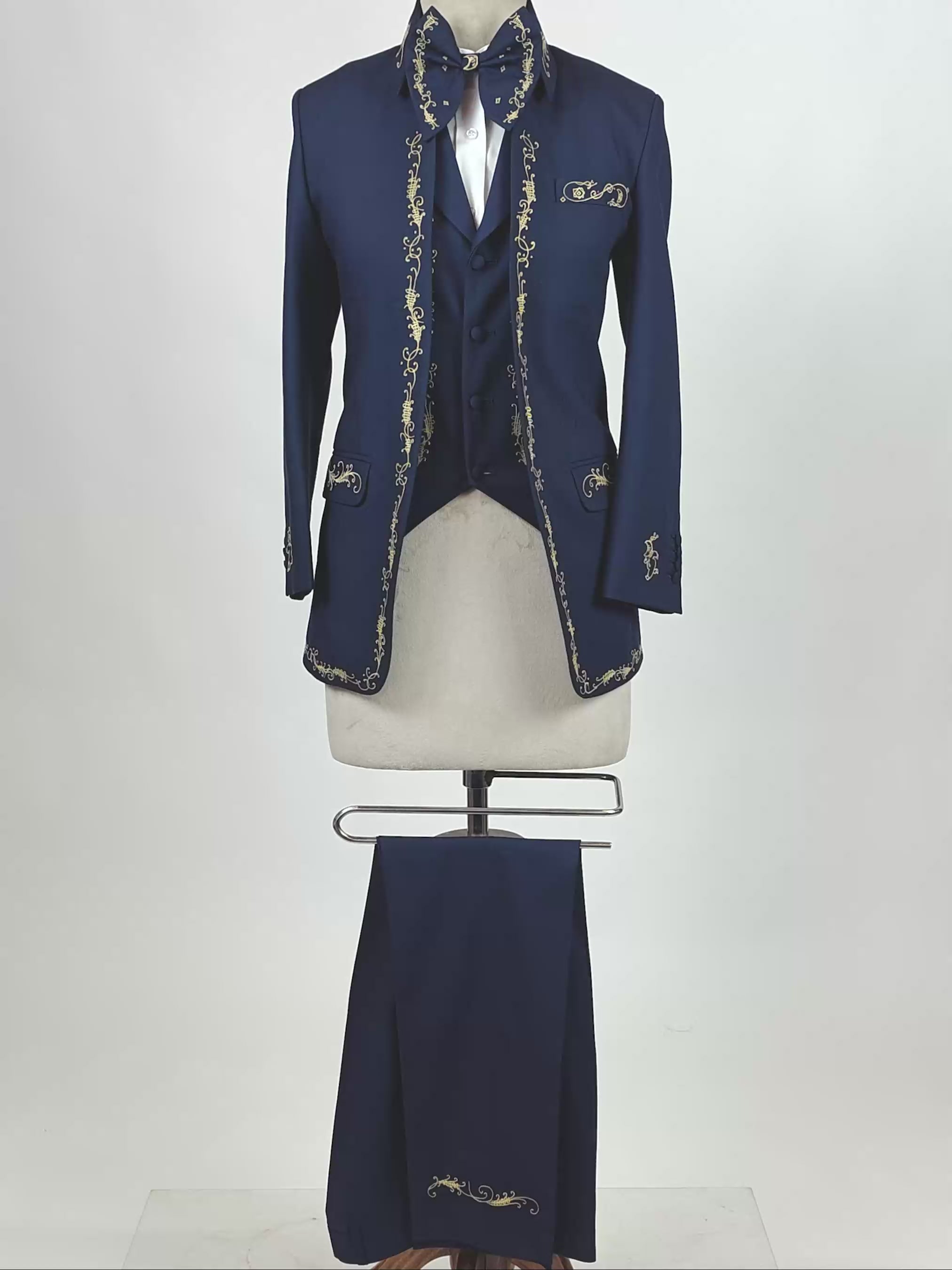 This navy embroidered mariachi suit features rich gold and floral hand embroidery inspired by classic Western and mariachi artistry. Crafted from premium fabric with a sharp, tailored fit, it offers both elegance and comfort. Ideal for weddings, cultural events, stage performances, fiestas, and special occasions, this statement suit is custom-made to order for a flawless finish and standout style.