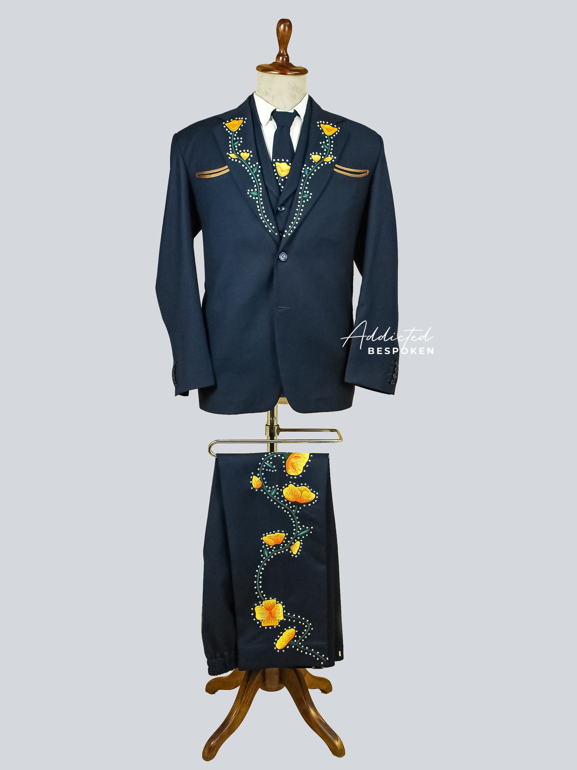 Make a bold statement at your wedding with this custom-made Poppy Flower Embellished Western Suit. The blazer and vest are adorned with intricate floral embroidery and rhinestones, exuding elegance and charm. Paired with high-waist pants, this ensemble is perfect for a cocktail attire wedding, showcasing your unique style and sophistication.