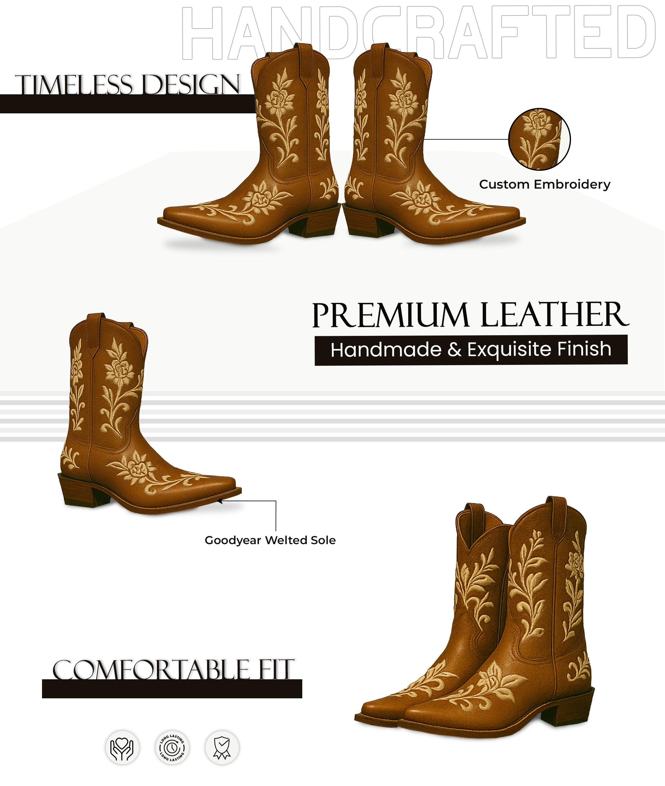 Step into the spirit of the open range with the Prairie Bloom Cowboy Boots. Handcrafted in rich chestnut leather, these classic snip-toe boots feature graceful ivory floral embroidery that climbs elegantly from the vamp to the shaft. Set against a serene countryside backdrop, the clean design captures the essence of rustic charm and Western tradition. Whether you're at a rodeo or strolling through the pasture, these boots are a timeless blend of beauty, comfort, and craftsmanship.