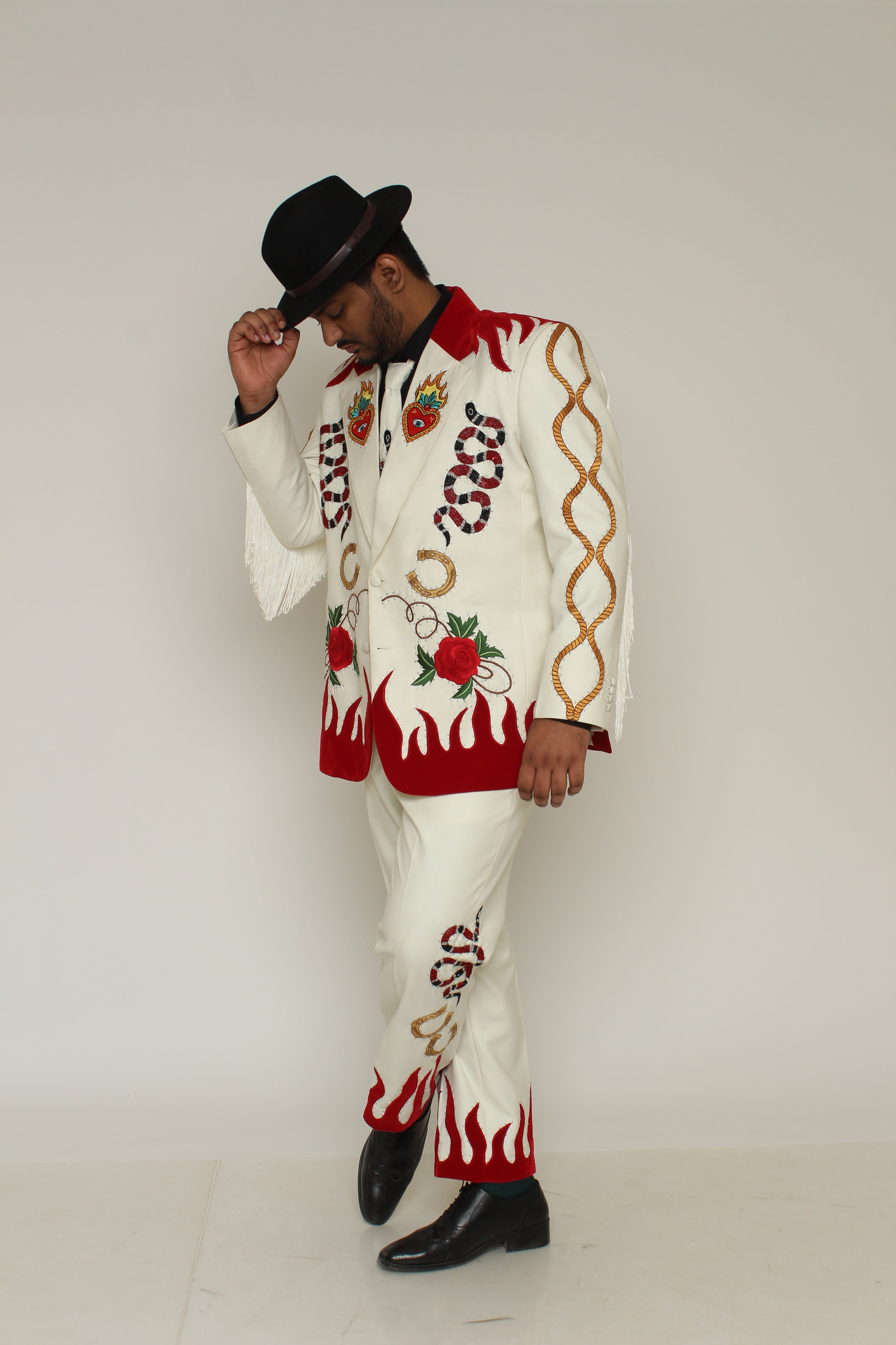 Elevate your wardrobe with this uniquely designed suit that combines rustic charm with contemporary sophistication. The set features a finely tailored jacket and pants, adorned with intricate floral embroidery and enhanced with stylish fringes for a bold, Western-inspired look. This ensemble effortlessly bridges tradition and modernity, making it ideal for formal occasions and special events.