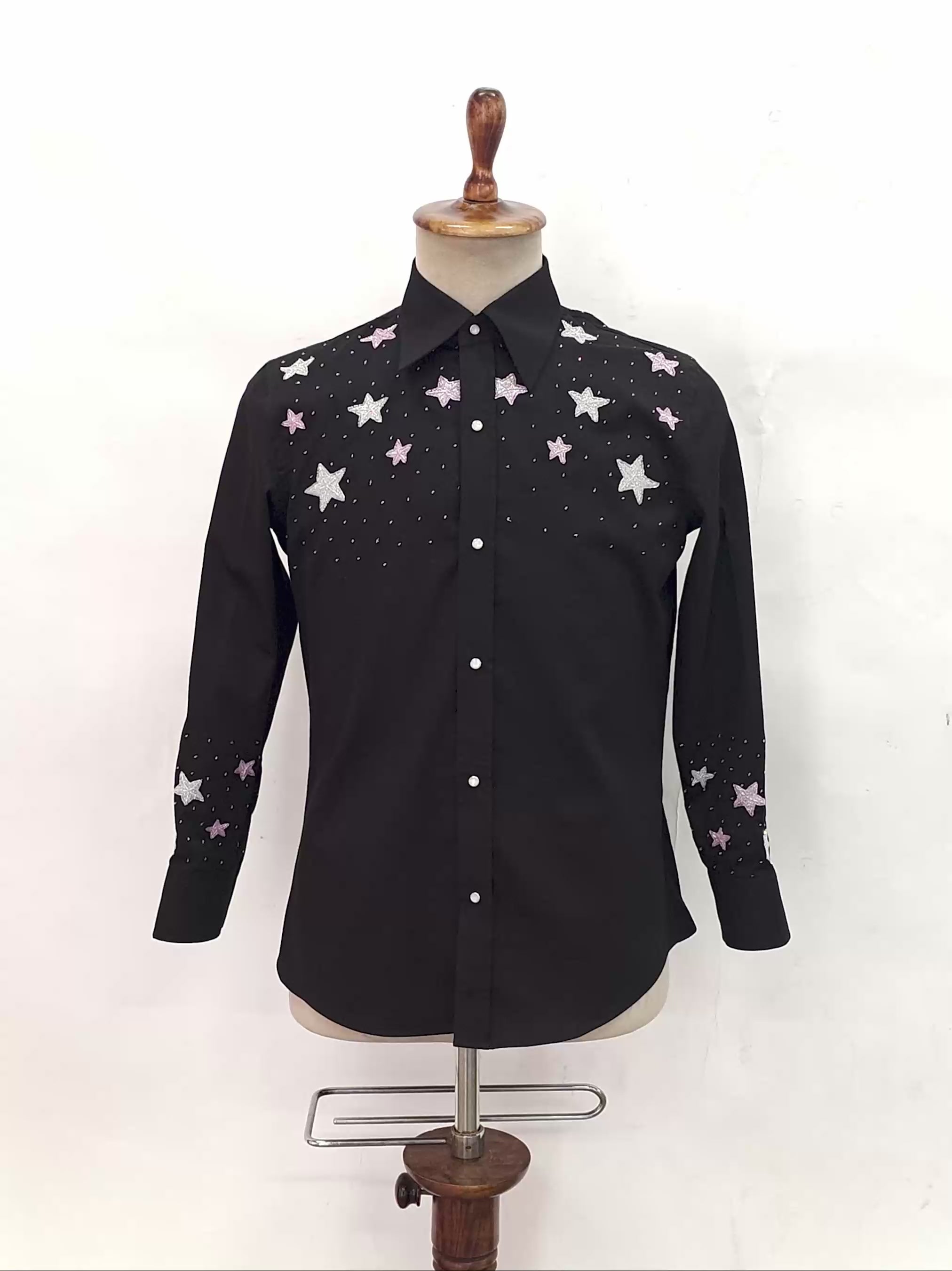 The Starlit Embroidered Shirt is crafted in deep black and adorned with delicate star embroidery that evokes a celestial night sky. Designed as a luxury statement shirt, it seamlessly blends refined tailoring with intricate hand embroidery, making it an ideal choice for evening wear, special occasions, and elevated couture styling.