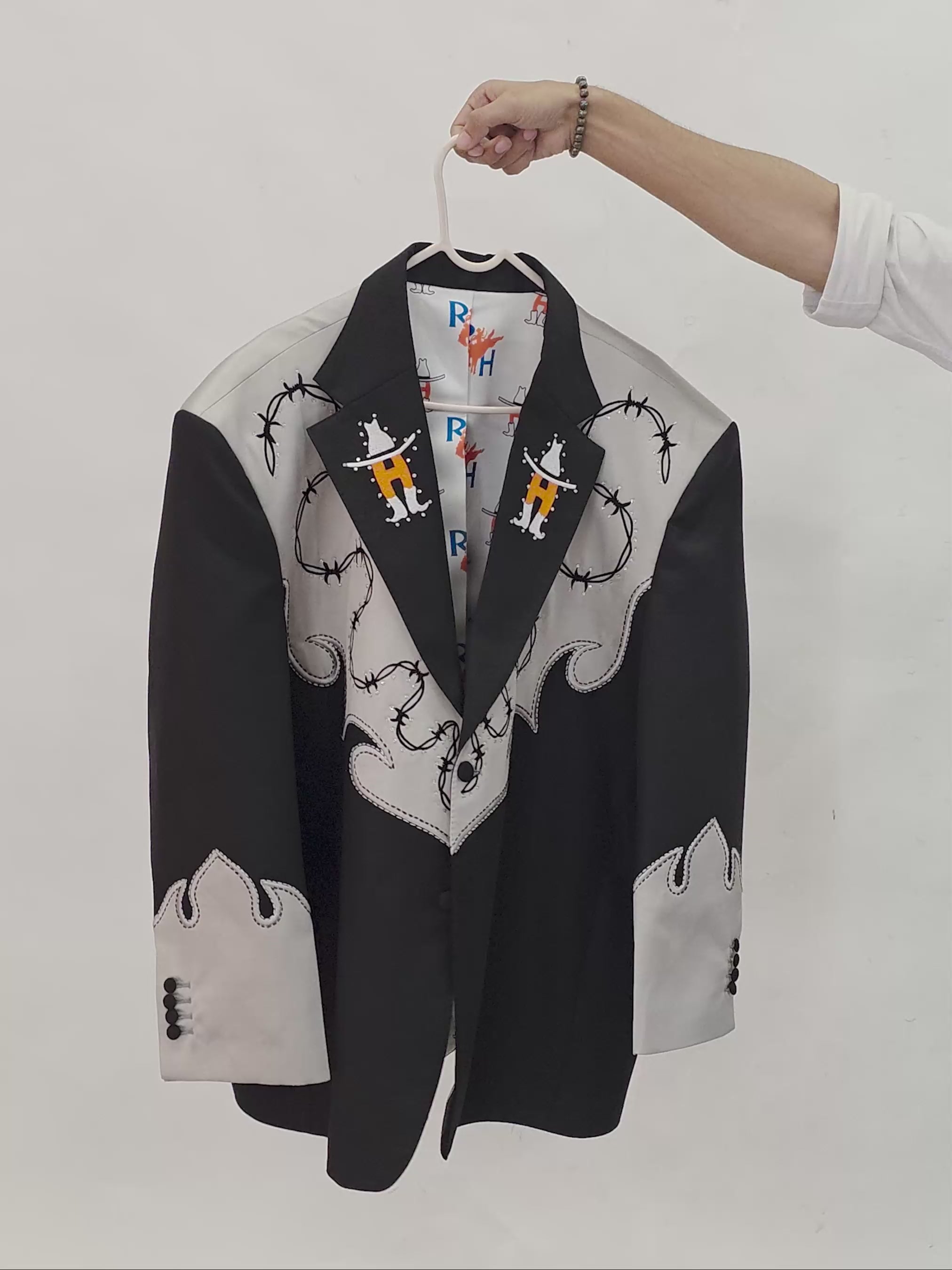 The Black Range Suit is a luxury hand-embroidered western couture suit crafted for modern connoisseurs. Featuring bold black and ivory detailing, this bespoke men’s suit blends western heritage with high-fashion tailoring. Designed for grooms, collectors, and statement occasions, it delivers precision craftsmanship, couture embroidery, and timeless bespoke elegance.