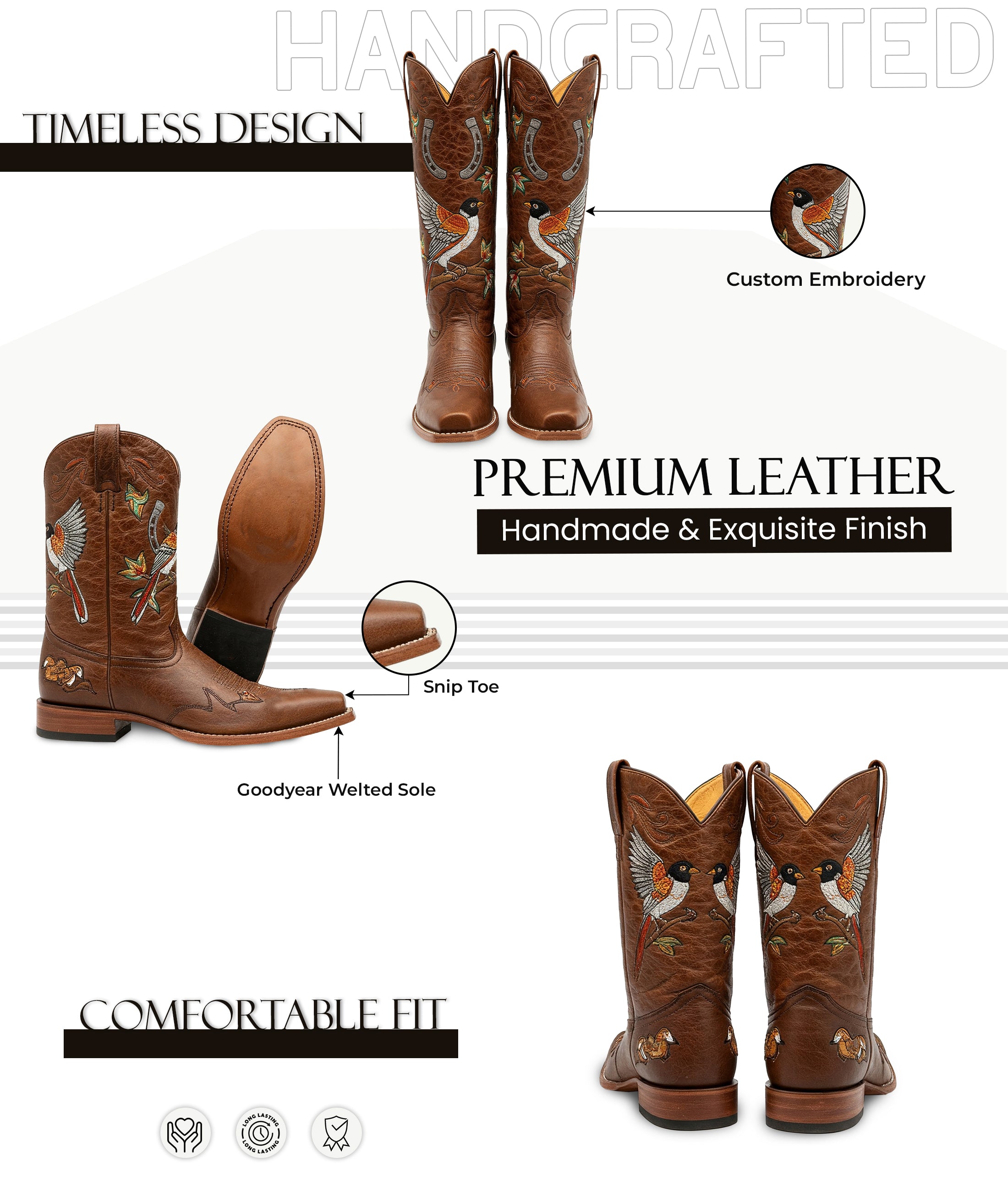 Let your style sing in the Western Warbler Boot, a tribute to the untamed beauty of the frontier skies. Crafted from rich saddle-brown leather, this boot features exquisitely embroidered warblers in mid-flight, framed by horseshoes and swirling leaf motifs. The design captures the delicate energy of birdsong against a backdrop of western grit. A classic square toe and low stacked heel offer everyday comfort, while the detailed vamp threadwork adds an edge. Perfect for those who walk with rhythm, freedom, and frontier flair.