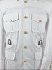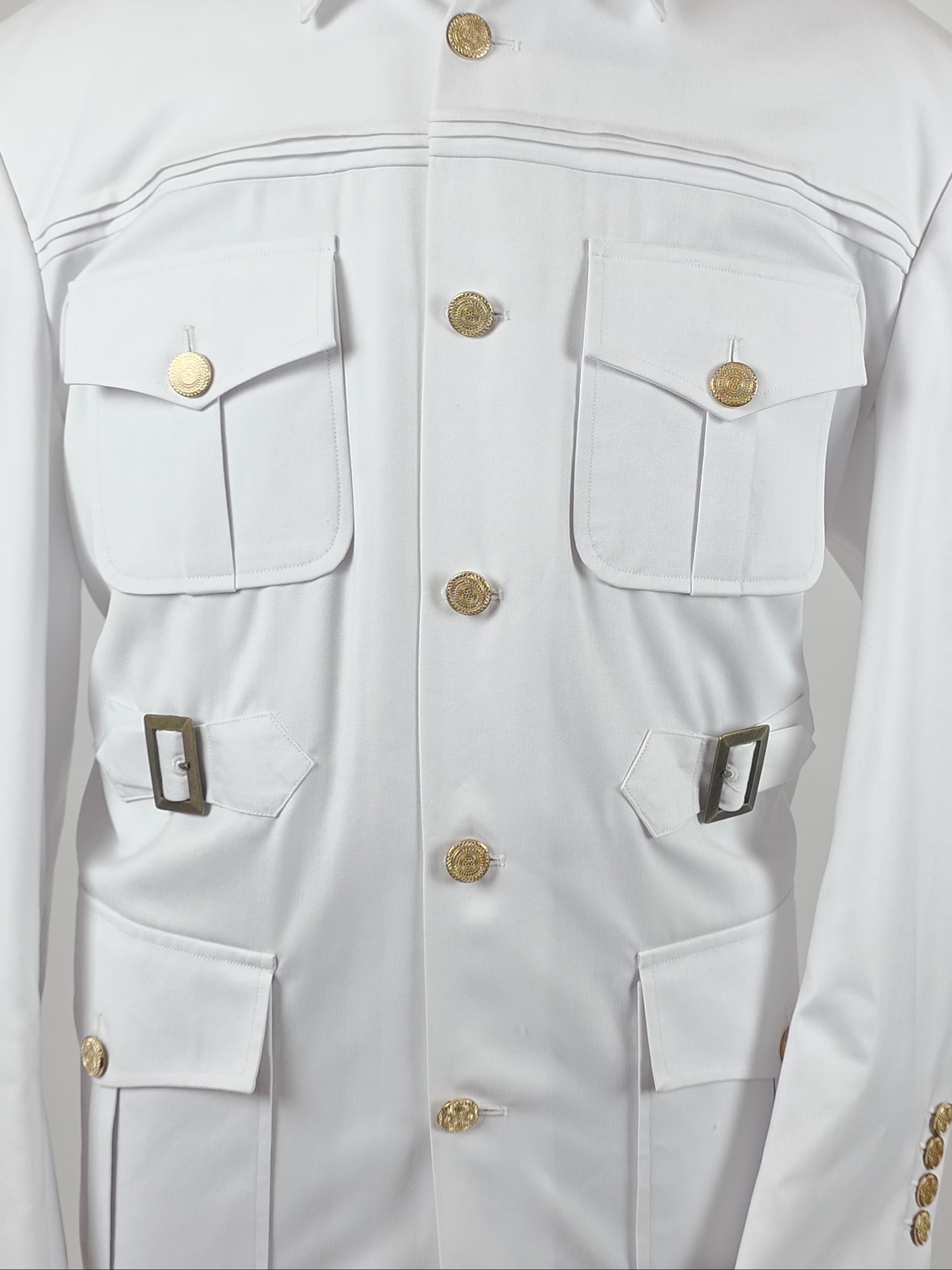 The White Heritage Safari Jacket combines timeless sophistication with modern tailoring. Designed in premium ivory cotton, this custom-tailored safari suit jacket offers structured elegance and everyday luxury. Featuring signature flap pockets, a belted waist, and golden button detailing, it balances functionality with refined aesthetics. Perfect for weddings, travel, and luxury formalwear.